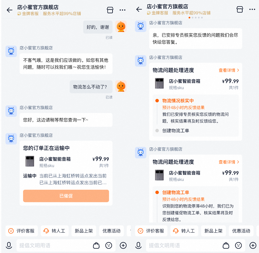 售后环节同样实现重要升级。双11期间,店小蜜与平台售后系统深度打通,支持物流查询、退定金、退差价等核心功能自动化处理。通过预判式服务,消费者无需转接人工即可解决多数问题,处理时间时长极致缩短至数分钟。
