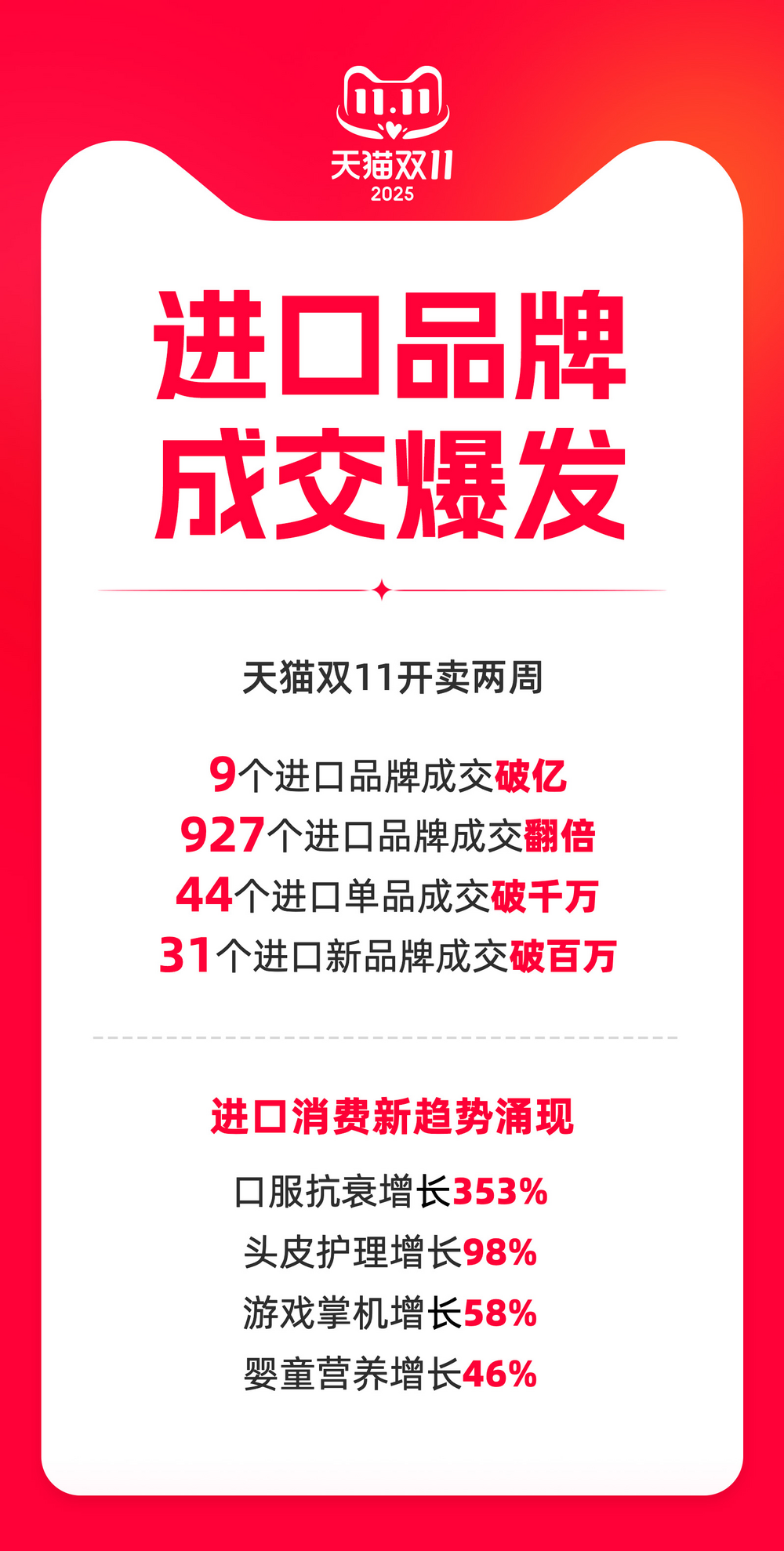 进口消费正在从“好价囤货”向“小众淘新”转型。消费者对专业、细分、个性化商品的需求凸显,口服抗衰、头皮护理、游戏掌机、婴童营养等趋势品类,在天猫双11增速强劲。