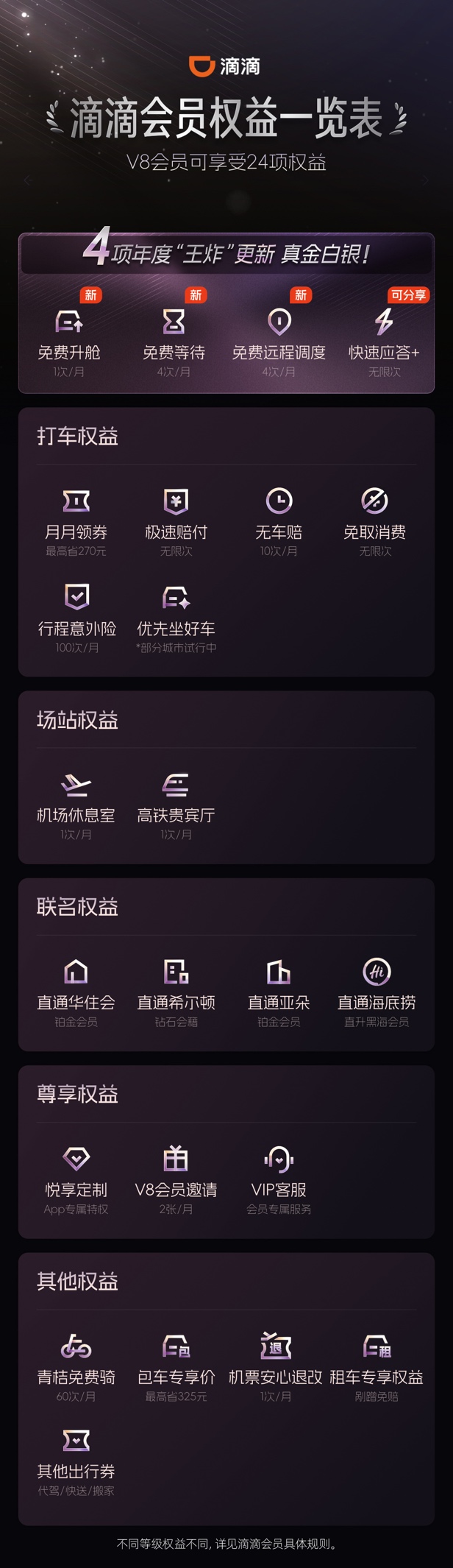 今年8月,滴滴会员焕新升级会员体系,推出四大权益类型,覆盖打车权益、联名权益、尊享权益、场站权益,提供超20项超值权益。围绕“目的地+”场景拓展出行边界,联合海底捞、华住会、希尔顿、亚朵提供联合会员,打通双方会员体系;去机场、高铁站,使用高铁贵宾厅、机场休息室权益享专属贵宾礼遇;VIP客服、悦享权益可让用户体验尊享服务,问题、答疑处理更迅速,黑金版App图标及页面尽显奢华感。此外还有无车赔、月月领券、青桔免费骑、租车/代驾/快送专属优惠等多重权益,服务滴滴会员的每一次出行。