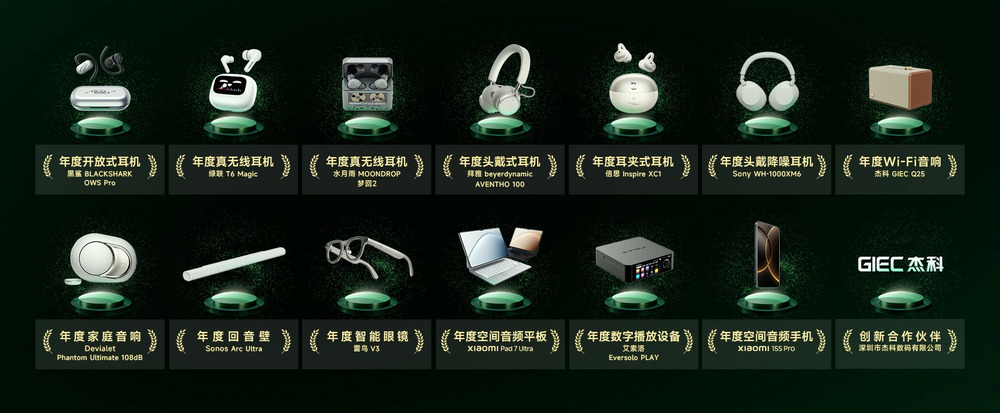 本届大赏在中国电子音响行业协会指导下,基于“客观硬件测试+权威主观听感”的综合评审体系,对已获得「臻品音质认证」的近40家品牌、100多款产品进行二次遴选,最终共有14款音频产品及品牌脱颖而出,荣获“2025 QQ音乐臻享奖”:年度耳夹式耳机—倍思 Inspire xc1、年度头戴降噪耳机—Sony WH-1000XM6、年度头戴式耳机—拜雅 beyerdynamic AVENTHO 100、年度真无线耳机—水月雨 MOONDROP 梦回2、年度真无线耳机—绿联 T6 Magic、年度开放式耳机—黑鲨 BLACKSHARK OWS Pro、年度Wi-Fi音箱—杰科 GIEC Q25、年度家庭音响—Devialet Phantom Ultimate 108db、年度回音壁—Sonos Arc Ultra、年度空间音频手机—XIAOMI 15S Pro、年度智能眼镜—雷鸟 V3、年度空间音频平板—XIAOMI Pad 7 Ultra、年度数字播放设备—艾索洛 Eversolo PLAY、创新合作伙伴—深圳市杰科数码有限公司。每一个奖项都是对以上产品和品牌在音频行业不懈努力的肯定,正是他们在声学技术、工艺设计、用户体验等方面的持续深耕,才为用户带来了更多兼具高品质与创新性的听觉享受。