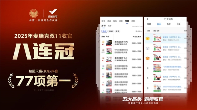 2025年双十一收官,全球家庭健身品牌麦瑞克发布战报,一举夺得天猫、京东、抖音平台77项第一,斩获天猫京东双平台销量和销售额第一,跑步机、动感单车、椭圆机、划船机、筋膜枪分别取得类目霸榜佳绩,同时这也是麦瑞克在618、双11实现销量和销售额的八连冠,再次以数据诠释其家庭健身行业的头部地位。