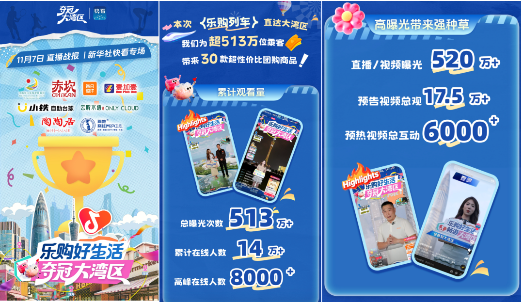 近日,抖音生活服务联合新华社快看发起的“夺冠大湾区”直播推广活动圆满收官。本次活动以“乐购好生活,夺冠大湾区”为主题,通过创新打造的“乐购列车”直播场景,直播总曝光量突破516万,助力引爆大湾区线下消费热潮,为消费者带来丰富福利。