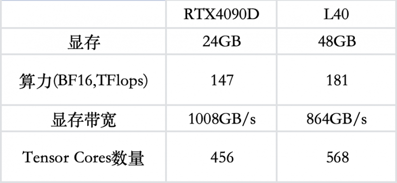 下面对比一下RTX4090D和同架构的数据中心GPU L40的参数差异,可以看出除了显存较小外, RTX4090D算力能达到L40的 80% 左右。因此在算力瓶颈的场景,如图像/视频生成等领域,RTX4090D的性价比是比较高的。此外,由于4090D支持FP8格式,在部分场景下可以用FP8模型来获得更优的性价比。
