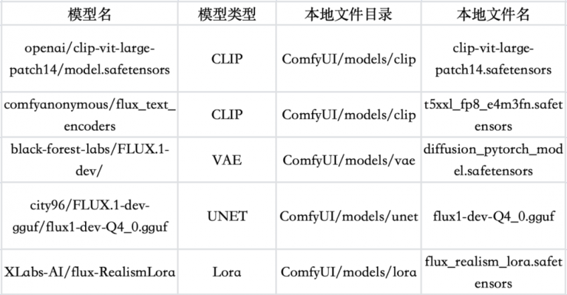 具体用到的模型信息如下表,下载后的本地文件名可以通过定义流程的json文件查询得到,该流程的json文件也放在本文的git工程中(https://github.com/ebtech-ebcloud/job-template/blob/main/paper/2510-consumer-card/FLUX_GGUF_WORKFLOW.json)。