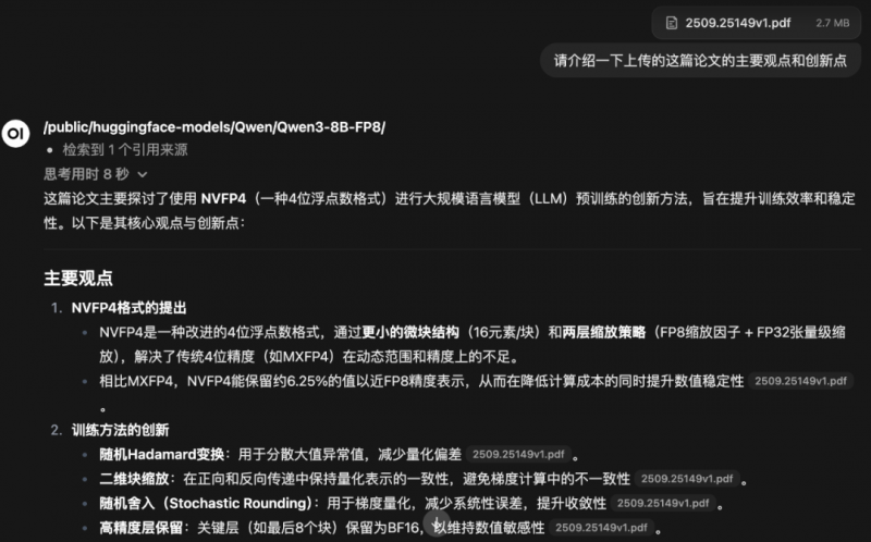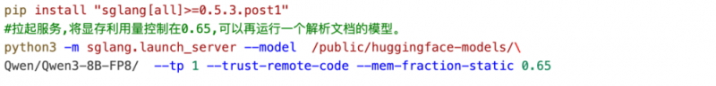 在该案例中我们用open-webui+SGLang的软件栈来运行大语言模型,我们选择的模型是Qwen3-8B-FP8,选择该模型的原因是该模型比较新,且有官方FP8量化版。我们提供的镜像中已经安装了sglang和open-webui的conda环境。使用该镜像,可略过3.2.1和3.2.2的安装步骤,直接在jupyter环境中/root目录下运行bash start_owu.sh即可完成sglang后端服务,owu前端和mineru的拉起。