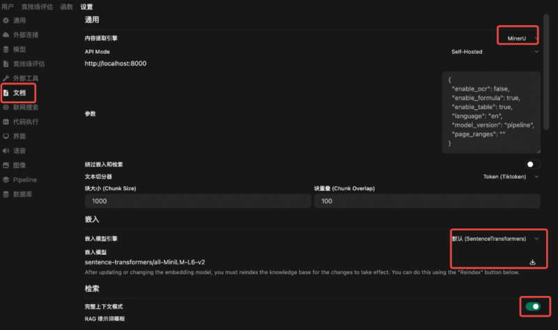 然后在OpenWebUI界面的管理员界面,文档Tab中将文档解析工具选择为mineru。注意需要选择嵌入工具和检索工具中的完整上下文模式,才能够解读整篇文档。
