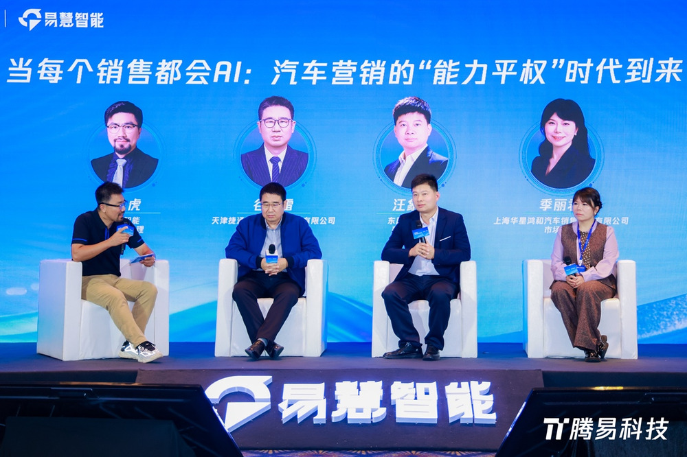 在圆桌论坛环节,易慧智能销售总经理雍虎与天津捷通达汽车投资集团有限公司事业部总裁谷亚雷、东风卓联集团新媒体部长汪象超、上海华星鸿和汽车销售服务有限公司市场经理季丽君等嘉宾,围绕“当每个销售都会AI:汽车营销的‘能力平权’时代到来”展开深度对话,共同探讨AI技术普及对营销组织、人员能力与生态格局带来的深远影响。