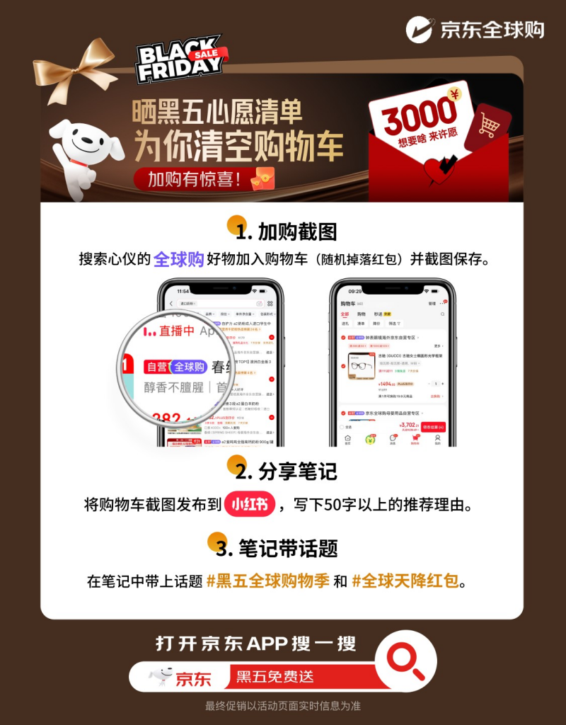 为进一步加码“黑五”福利,京东全球购还将带来“全球天降红包”福利,消费者浏览全球购商品时,将随机触发限时折扣,能够解锁更多专属优惠。此外,即日起,消费者还可添加心仪商品至购物车,带话题#黑五全球购物季#和#全球天降红包#截图分享至小红书,即有机会赢取“清空购物车”大奖。