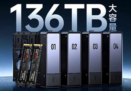 存储扩展灵活性直接影响办公数据的长期管理,铁威马的3个M.2插槽在此维度优势显著。小型办公可将M.2插槽组建RAID 5,用于存储高频访问的重要文件(如项目方案、财务数据),兼顾速度与冗余——即便单块 M.2 硬盘故障,数据也不会丢失,避免因数据损坏影响办公进度。搭配4个HDD 盘位(单盘最高 30TB),铁威马整机 144TB 容量,能轻松归档3-5年的办公文件,无需频繁更换硬盘;绿联仅2个M.2 插槽,无法组建RAID 5,只能选择单盘或RAID 0,前者无冗余风险高,后者虽快但一块硬盘故障即丢失数据,不符合办公场景的安全需求。