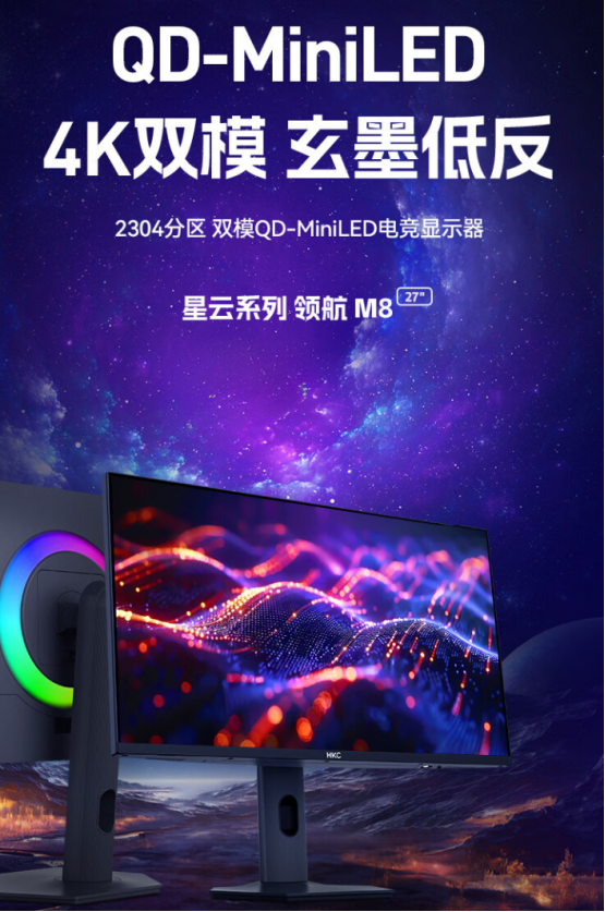 在显示器技术日新月异的今天,HKC作为显示行业的领军品牌,再次以创新科技引领潮流,推出了星云系列领航M8 MiniLED显示器。这款集顶尖显示技术于一身的力作,不仅支持4K@160Hz/ FHD@320Hz双模,还搭载了玄墨低反屏与HDR1400高动态范围显示,以首发3299元的亲民价格,为电竞爱好者、专业设计师及影视发烧友带来了前所未有的视觉盛宴。