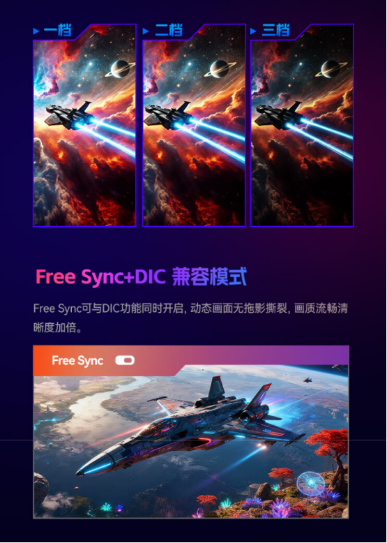 除了核心画质配置,领航M8在游戏辅助功能上也做了不少针对性设计,其内置了Gaming Visiondock控制功能,用户可以通过软件自定义显示参数,如响应时间、色彩模式等,轻松打造个性化的游戏显示方案。同时,DIC SYNC动态模糊消除技术的加入,有效减少了高速运动画面中的模糊现象,确保画面锐利无残影,让玩家在激烈对战中捕捉每一个精彩瞬间。另外还有AI智能辅助抗闪,六轴精准校色等功能,进一步帮助玩家提升最佳竞技状态。