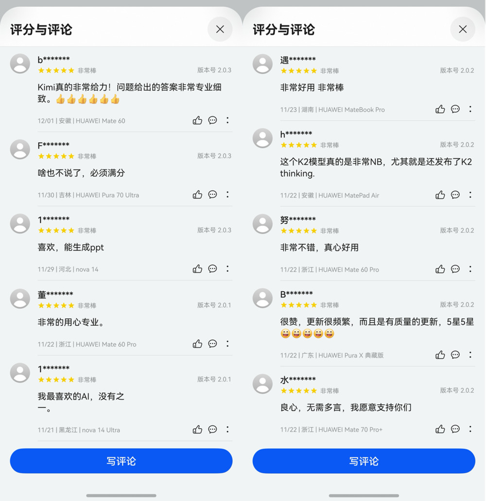 在华为应用市场,高达4.8的评分和“最喜欢的AI,没有之一”“非常给力”等好评,充分说明了用户对Kimi的喜爱。未来,鸿蒙版Kimi将继续补齐功能并不断优化细节,致力于成为更智能、更懂用户的智能助手。