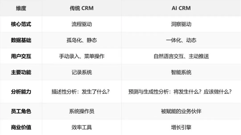 在早期阶段,CRM是一个“记录系统”,帮助销售填表、管理客户;随后,它变成了“流程系统”,强调销售管控、业绩追踪;如今,AI技术让CRM进化为“智能伙伴”,能理解、学习、预测,甚至主动协助销售行动。