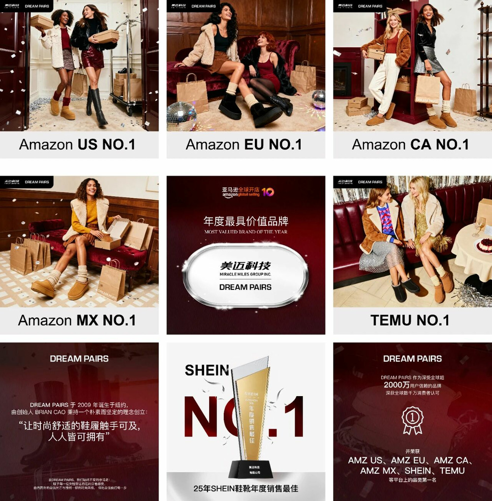 凭借出色的品牌力与产品力,美迈科技已稳居行业引领地位,目前已成为亚马逊中国鞋履类目排名第一的品牌,其topshoes us店铺常年位列亚马逊美国站全品类店铺前十,多品牌在细分赛道实现“霸榜”表现: