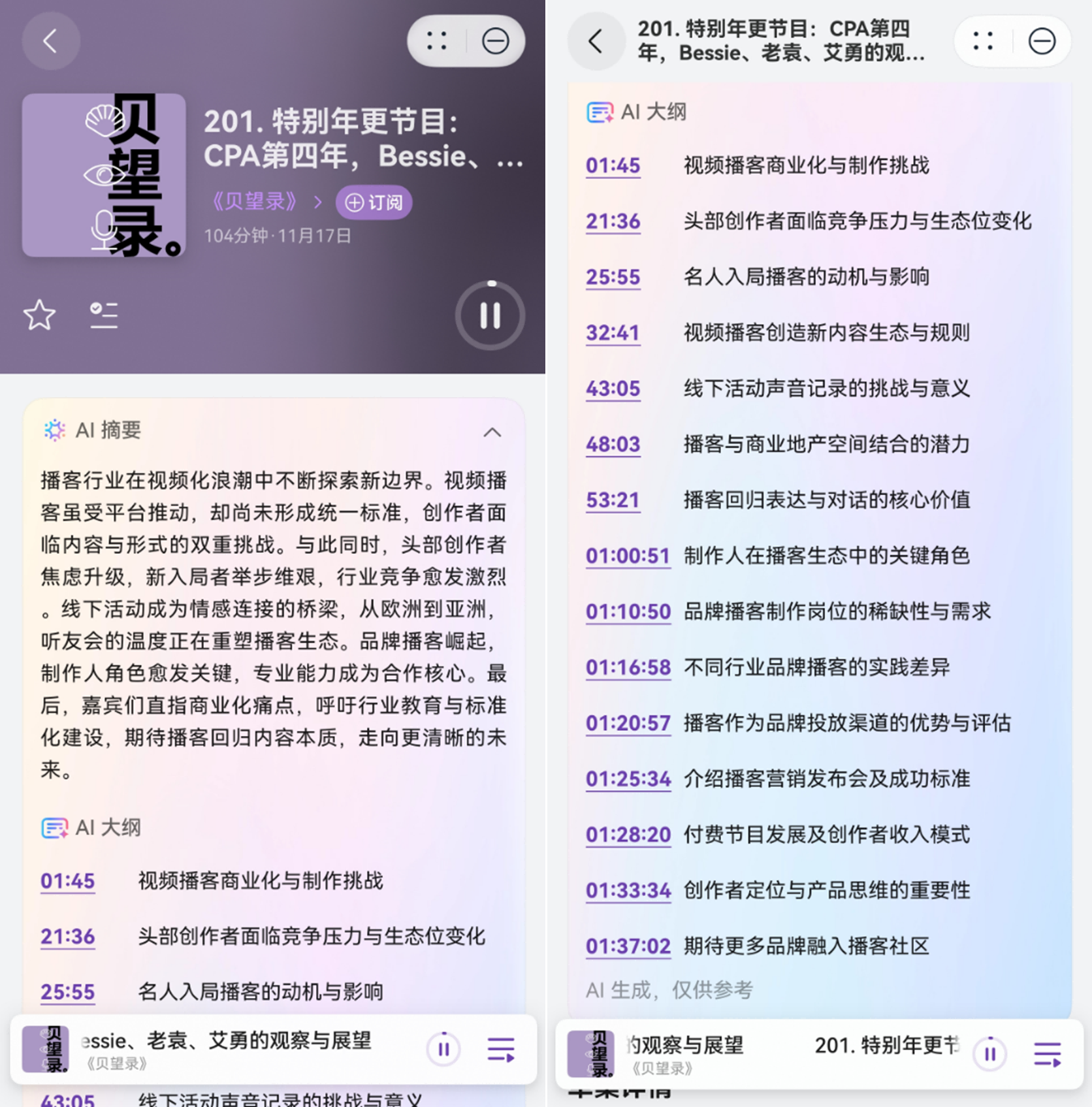 随着HarmonyOS 6发布,元服务播客以轻量级应用服务形态与AI技术功能创新,为用户带来高效、便捷的播客新体验。依托华为昇腾推理卡的强大算力,结合先进大模型推理能力,创新推出 AI Shownotes功能,可自动生成AI摘要和AI大纲。AI摘要可以将几十分钟的有声内容概括成200字以内文字,使听众能从文字判断是否对内容感兴趣,从而决定是否开始收听对应的播客;AI大纲按播客时间轴分段打标签,让用户能一目了然从不同感兴趣点开始收听。AI Shownotes能为用户自动总结出重点内容,比如讲了什么故事、有哪些观点、关键结论是什么,内容逻辑清晰、语言自然,如同专业编辑撰写,用户无需自己整理播客精华内容纪要,节省时间又高效率。