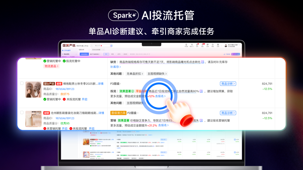 最近,面向产业带厂商主打半托管的淘工厂和淘宝国货严选上线”星火spark”智能系统。该系统主要依据半托管服务模式,把商家们最头疼的运营环节拆解,分别从AI商品策划、AI商品要素、AI营销投流以及AI服务托管层面,用”星火spark”AI智能系统分别解决”卖什么”、“卖点在哪里”、“怎么卖爆”以及”客服体验”这四大运营难题。