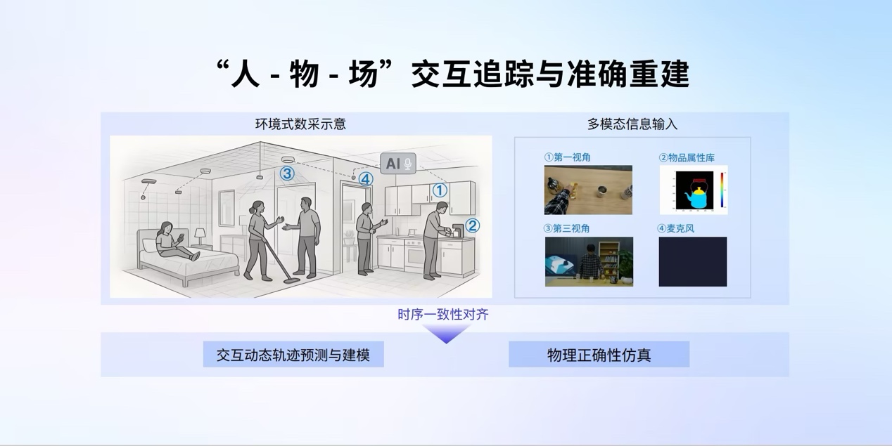 环境式数据采集技术以人为中心构建全要素采集体系,整合第一视角与第三视角视频、力触觉信息、运动轨迹、语音等多模态数据,构建基于物理基础的3D资产库,全面覆盖具身模型训练所需的各类交互信息,实现了多视角协同、长程任务覆盖与全维度信息捕捉的跨越式升级。