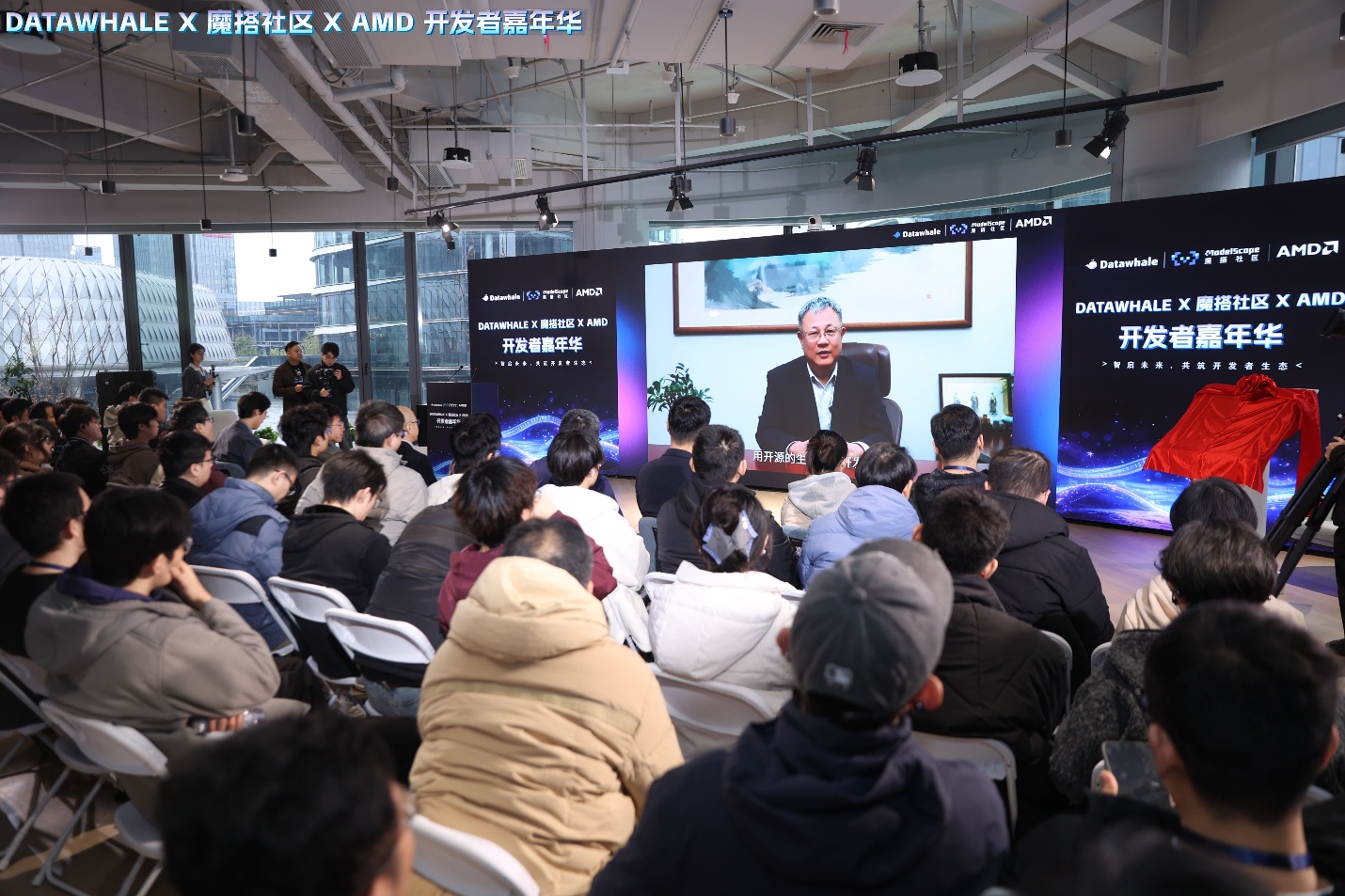 在开场的视频致辞中,AMD高级副总裁、大中华区总裁潘晓明表达了开源、开放是AMD坚持的核心价值,一直致力于支持并推动开源生态的蓬勃发展, 期待在魔搭社区和Datawhale这两大领先的开源社区中,AMD的创新技术与开发者的创新智慧,能够通过开源的力量融合在一起,激发潜能,为AI的发展与普及注入源源不断的动力。