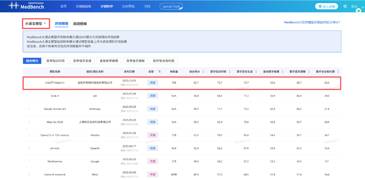 12月16日,中文医疗大模型权威评测平台MedBench4.0发布最新评测结果。云知声自主研发的“山海医疗大模型(UniGPT‑Med)”展现出全面领先的技术实力,一举斩获医疗智能体、医疗大语言模型、医疗多模态大模型三项技术范式,成为本次评测中表现最为突出的“三冠王”。