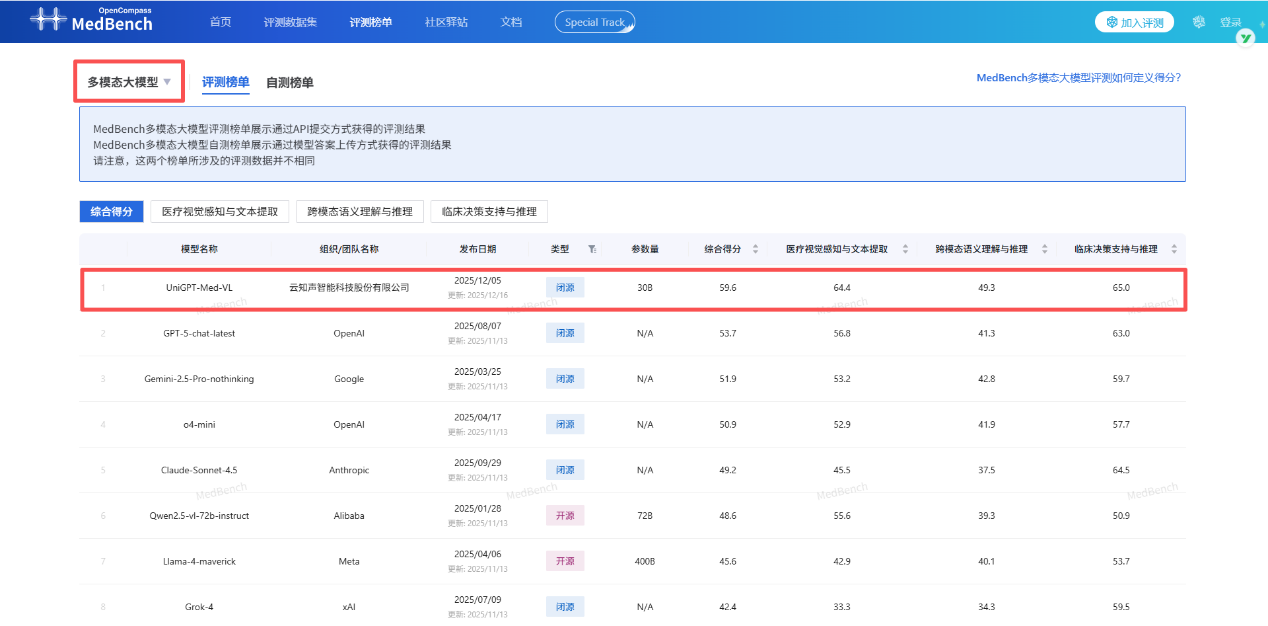 UniGPTMedVL则在医疗多模态大模型评测中以综合得分59.6分摘得桂冠,领先第二名GPT-5(53.7分)近6分,展现出绝对技术优势。