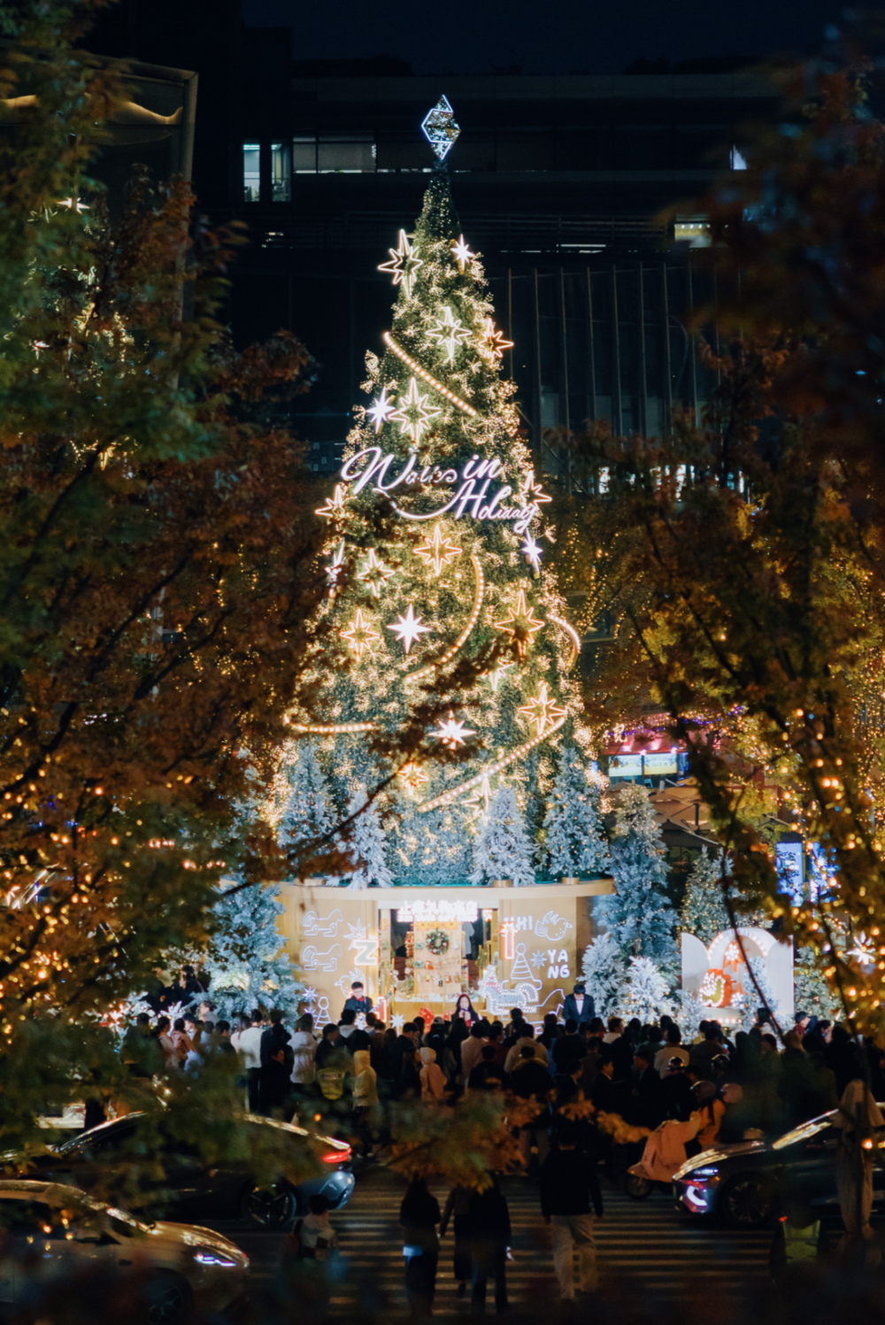 上海虹桥天街以15米璀璨许愿树为核心,树下融入“止痒礼物商店”,环绕近千平方米小型圣诞树矩阵与旋转机械装置,共同构筑“都市奇幻森林”,点亮商务区夜景。连廊上“祝我美梦成真”的字样格外醒目,吸引众多顾客驻足打卡拍照。