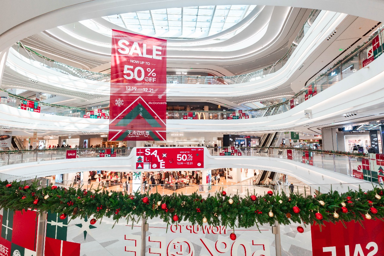 “5折直降”的醒目标语,延续了鲜明的视觉冲击力,同时今年在空间氛围上进一步升级——玻璃护栏以雪松枝条装饰,各商户门前也统一布置了圣诞树。这些精心的视觉点缀,不仅增强了节日的仪式感,更共同营造出岁末感恩回馈的浓厚促销氛围。
