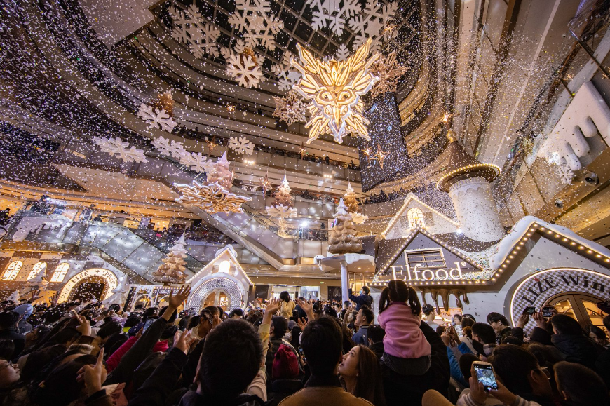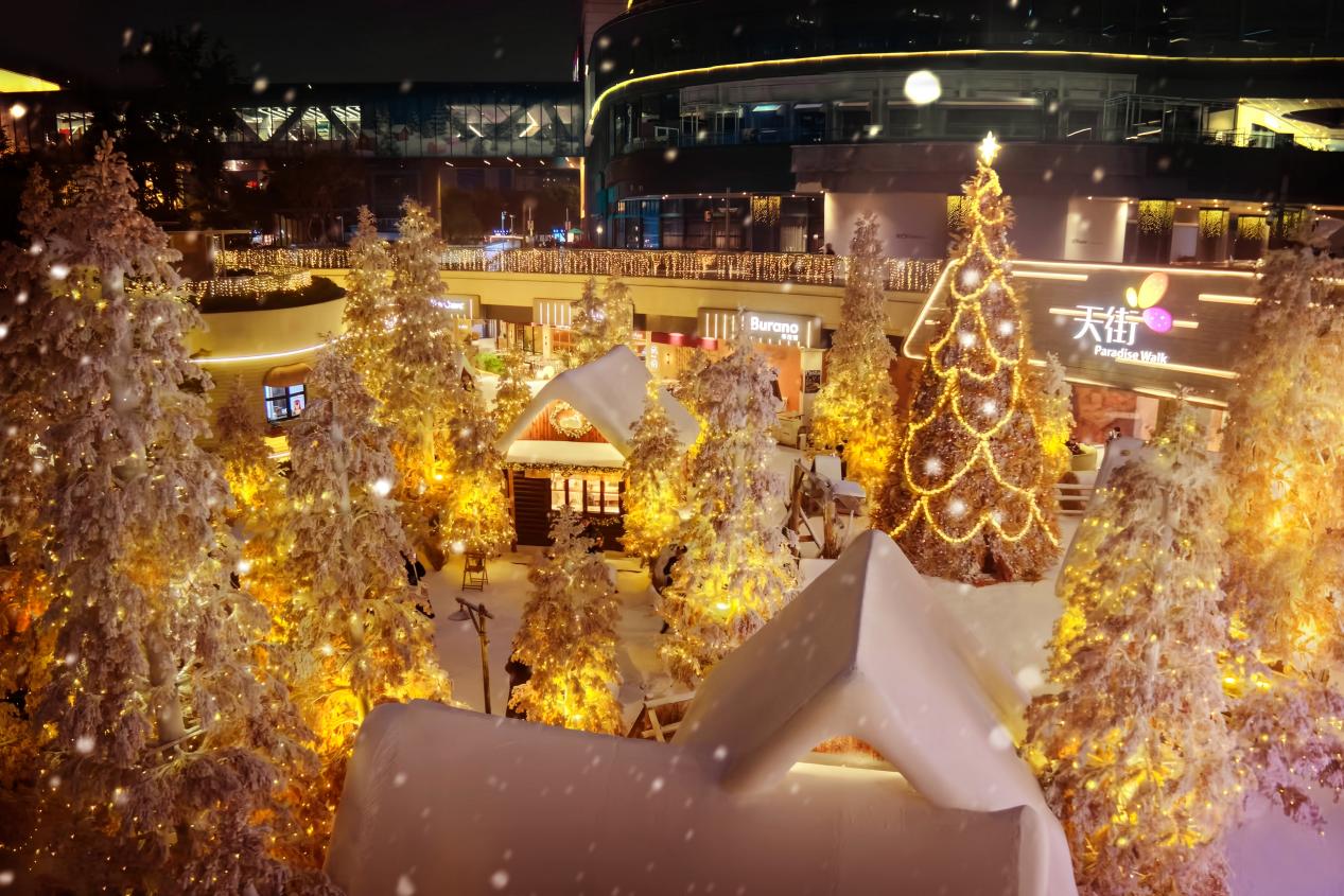 苏州狮山天街以2000平米雪地森林、木屋村落、松鼠牧场及10米高圣诞树装置,配合整点飘雪,营造丰富的江南雪乡体验。