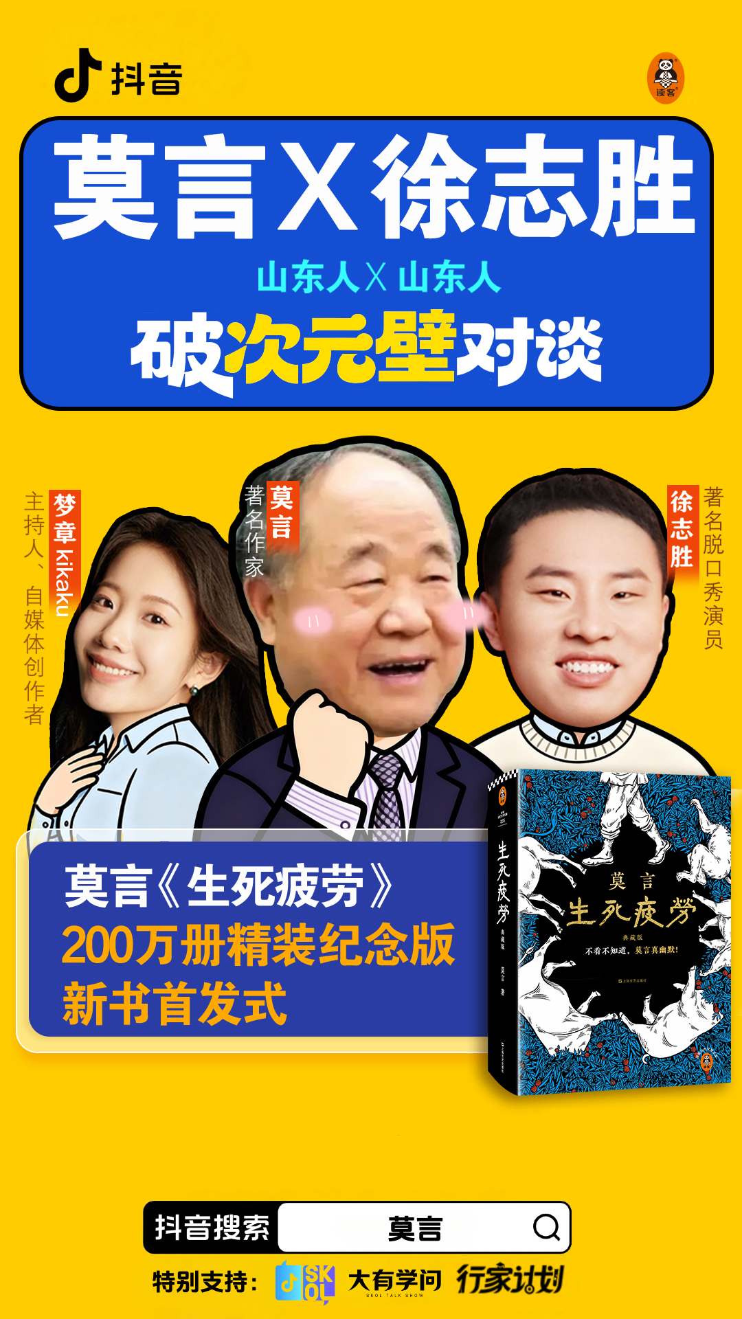 12月23日晚间,莫言携手脱口秀演员徐志胜、主持人@梦章kikaku 现身抖音,完成首场“打破次元壁”的跨界直播对谈。本次直播以《生死疲劳》精装典藏版上线为契机,聚焦文学创作故事、当代年轻人精神现状等议题,用文学与喜剧的碰撞,为近300万网友带来了一场兼具知识厚度与欢乐氛围的思维盛宴。