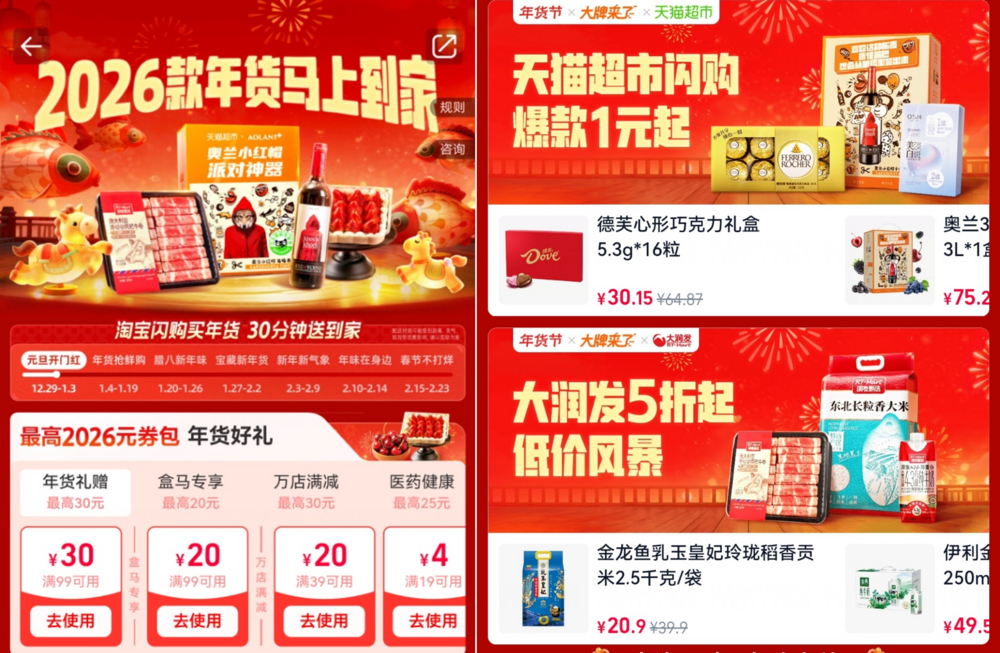 据悉,活动期间,用户搜索”年货节”进入会场,可领取最高2026元的券包,用户领券下单可享受多档满减优惠,覆盖百货、超市、酒水、生鲜等全品类商家。