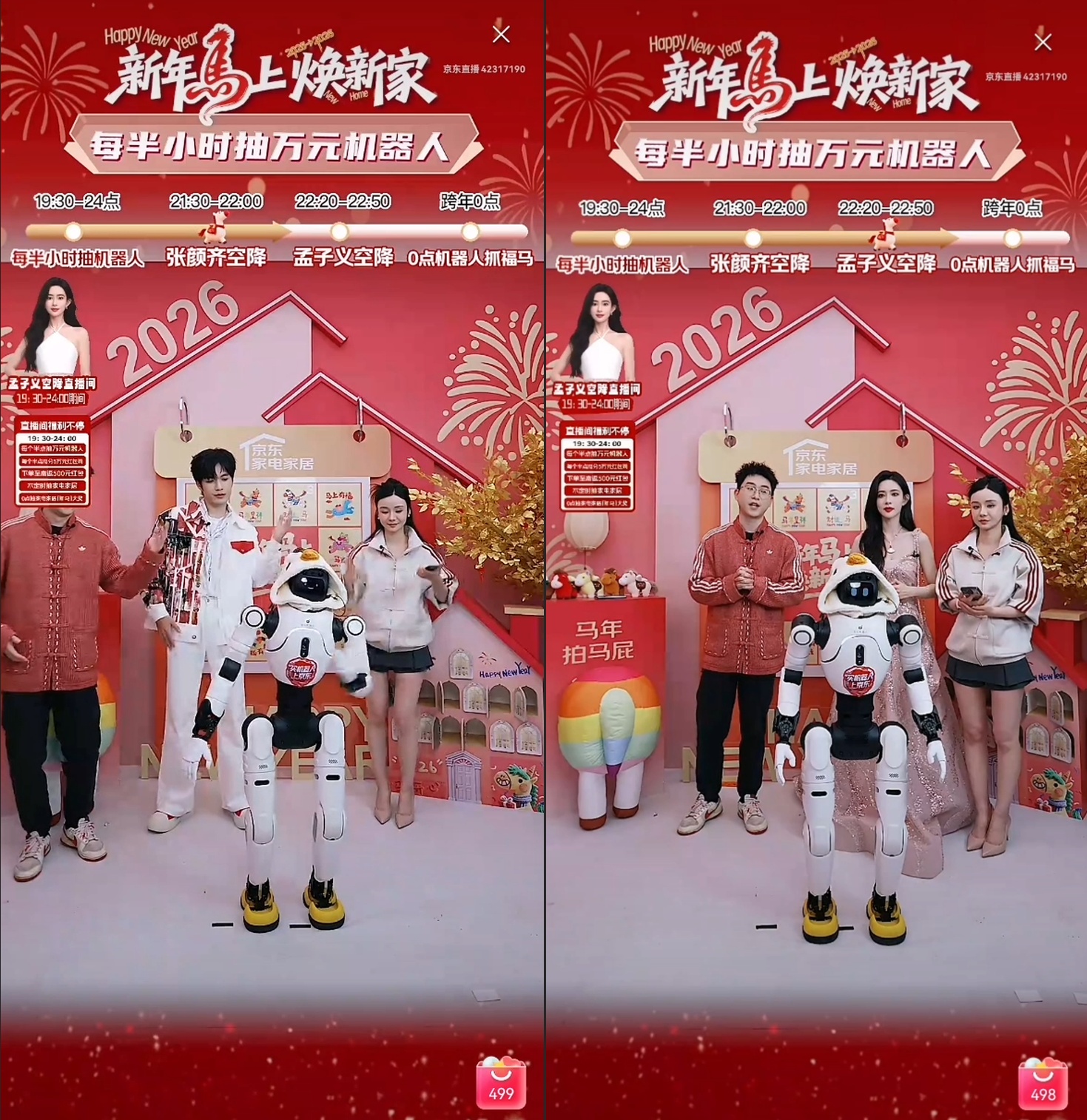 在京东直播间中,智元远征A2和孟子义唱歌接龙,一不小心唱歌“走调”,在线展示高情商;与张颜齐一起送上川味儿祝福,连词成句、即兴说唱、夸夸老己……样样能行。除了展示语言实力,远征A2还现场撰写了“马上有钱”、“抓马”等新春祝福送给大家。灵犀X2则和孟子义、张颜齐斗舞,把直播间的气氛拉满。
