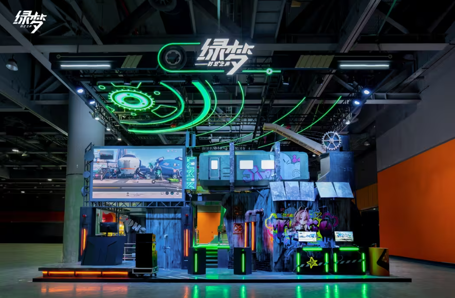 本届萤火虫漫展,《绿梦:时空之声》为观众带来现场最具末日科幻美感的置景,展台以展现后灾难时代的人类文明为核心设计理念,造型融合工业朋克与废土美学,呈现出极具辨识度的视觉风格——半空中呼啸而过的有轨电车,复古的机械框架结构,搭配锈蚀钢板、管道齿轮与发光线路,营造出末世都市中顽强运行的工业基地氛围。展台整体布景层次丰富,将“废墟中的希望”这一概念具象化,为玩家构建出真实可感的游戏世界入口。