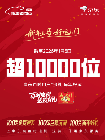 上京东APP搜索“百吋送装有礼”购买百吋电视,不仅可以享受100%免费送装一体服务,还能获得一份“马上来财”京东坚果礼盒。此外,京东推出“特殊墙体安装费用全免”升级服务,真正实现“明码标价、一次到位”,打破行业加价陋习。新年活动上线至今,京东已完成超10000单百吋电视免费送装,将年味氛围和沉浸式观影体验送往更多家庭。