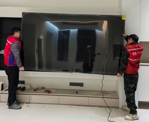 在极端条件下,京东送装一体的能力同样经住了考验。河南省的刘先生家住9层,受电梯尺寸影响曾一度放弃购买百吋电视。京东线下服务店的胡师傅在上门勘测后,结合楼体结构与入户条件,判定可采用吊装方式完成入户,并在送货当天对楼道、墙面与电视机身做全方位防护,吊车和相关费用全部由京东承担;另一位河北的赵先生住在6楼且没有电梯,京东服务人员韦师傅和团队提前测量楼道的每一个转角与狭窄点位,搬运过程中全程加固防护,在多人协作的配合下,最终将百吋电视顺利入户并完成安装。