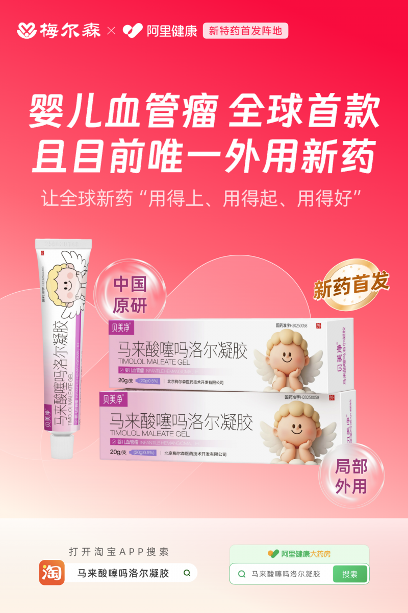 1月13日,全球婴儿血管瘤治疗领域迎来一项来自中国的里程碑式解决方案。由北京梅尔森医药技术开发有限公司历时十二年自主研发的改良型新药——马来酸噻吗洛尔凝胶(商品名:贝美净®),在阿里健康全网独家首发。即日起,家长只需通过淘宝搜索“贝美净”,经在线专业问诊后,即可开启科学、安心的规范治疗。