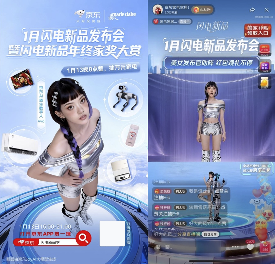 在以情感共鸣赋予产品温度的同时,京东家电家居“闪电新品”发力技术创新赋能营销升级。依托京东科技的 AI 核心能力,通过数字人Ava直播、数字男团E'Core MV、数字人时尚大片等一系列创新形式,构建起“技术+内容+产品”三维融合沉浸式体验矩阵,让优质新品的价值传递更生动、互动更深入,精准触达更多消费者。