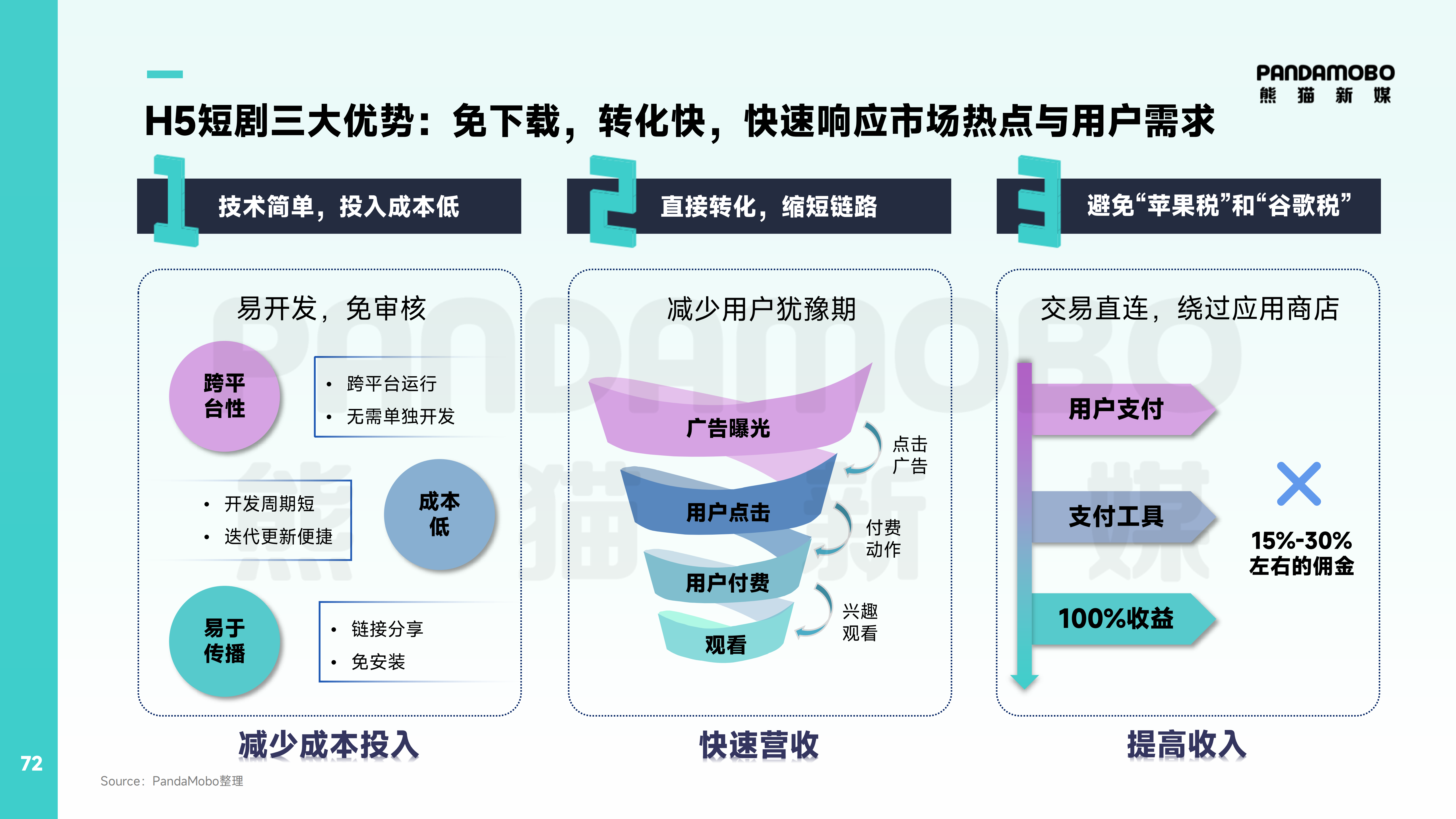 数据显示,头部H5短剧月访问量已达百万级,凭借“免下载即看、转化路径短、响应热点快”三大优势,H5短剧成为腰部厂商试水与头部厂商矩阵布局的重要形式。H5短剧从技术上通过跨平台运行、支付直连的方式,绕过应用商店15%-30%的佣金抽成,将用户转化链路从“点击-下载-注册-付费”压缩至“点击-付费”两步,有助于促成转化。
