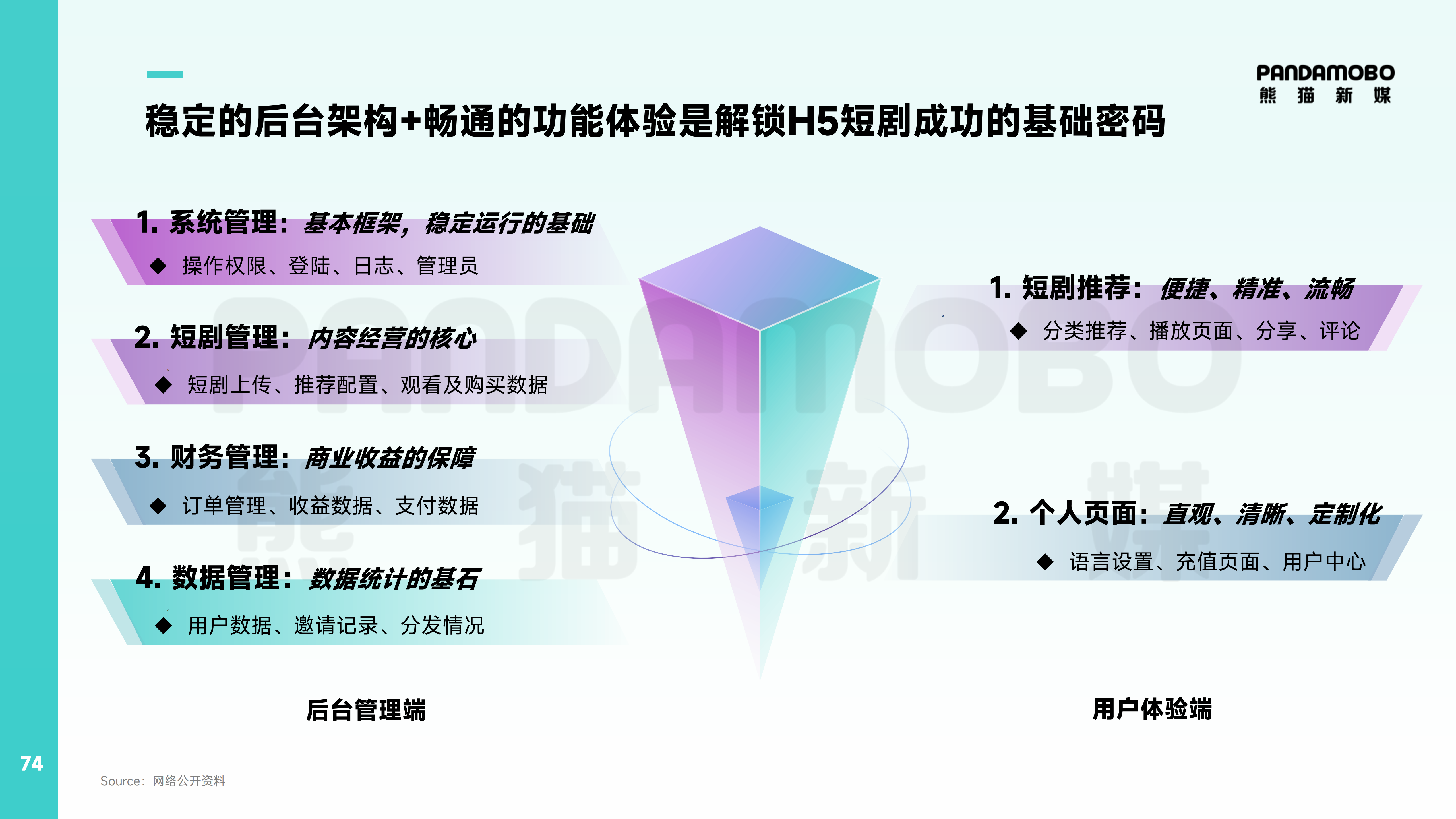 PandaMobo在报告中梳理了H5短剧覆盖后台搭建、内容适配、本地化支付、投放优化等全链路的完整系统,例如: