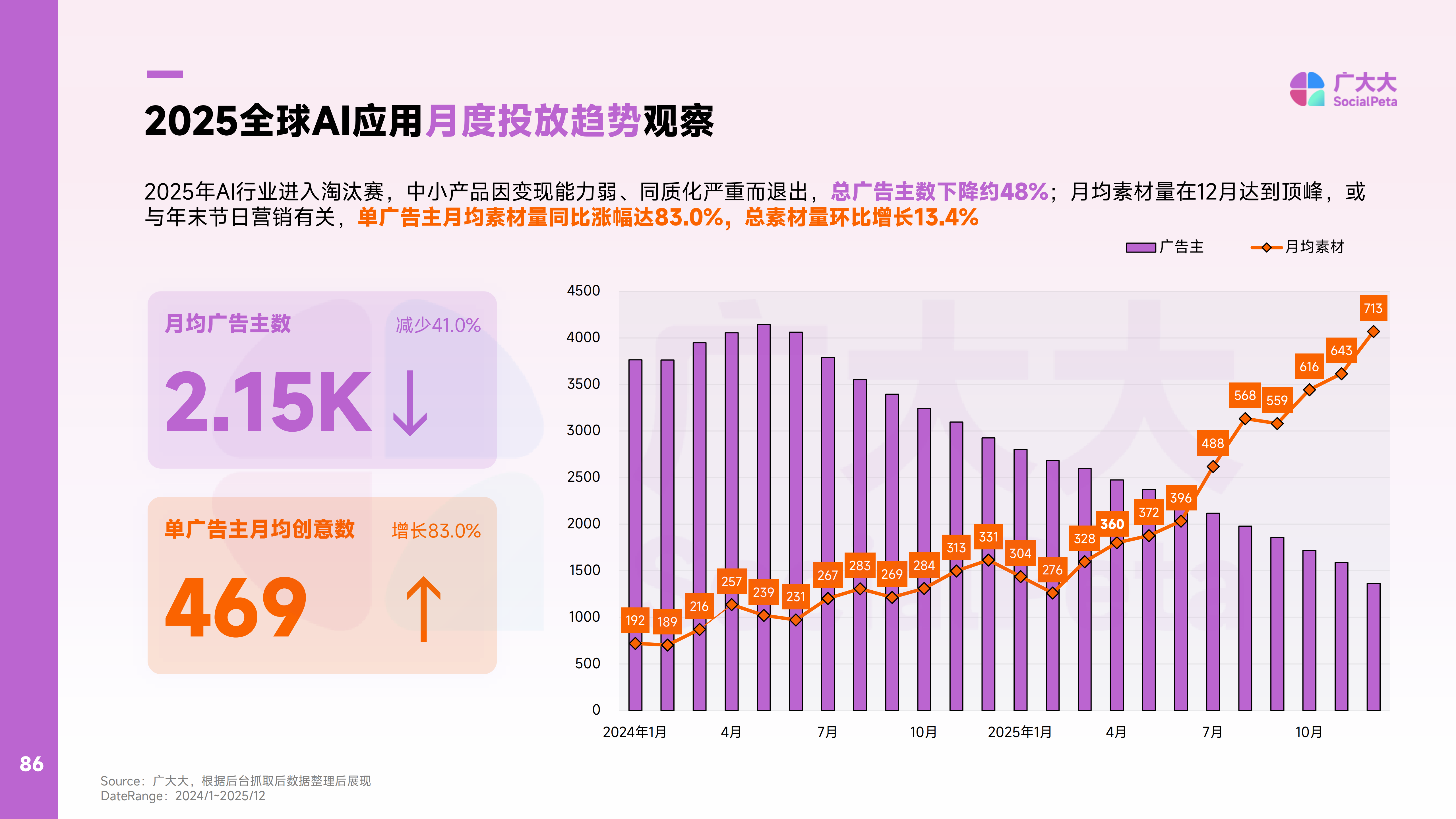 2025年是AI应用出清的淘汰年——中小产品因变现能力弱、同质化严重而退出,广告主总数下降48%,但单广告主月均素材量激增83%,12月总素材量环比再涨13.4%。报告预判,2026年将成为AI应用出海的商业价值兑现元年,技术成熟、市场需求与全球化布局形成合力,推动行业从技术赋能向规模化变现跨越。