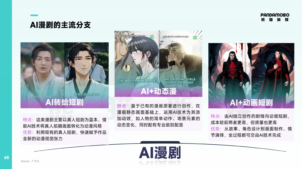 但AI不止于工具性赋能,它深度影响了短剧创作,更是催生出“零真人成本”的内容新物种AI漫剧。PandaMobo系统梳理了AI漫剧三大形态:AI转绘短剧将真人画面转化为动漫风格,实现IP视觉焕新;AI+动态漫基于漫画原著添加动效与配音,激活存量IP价值;AI+动画短剧由AI全流程创作,虽成本更高但质量突破上限。