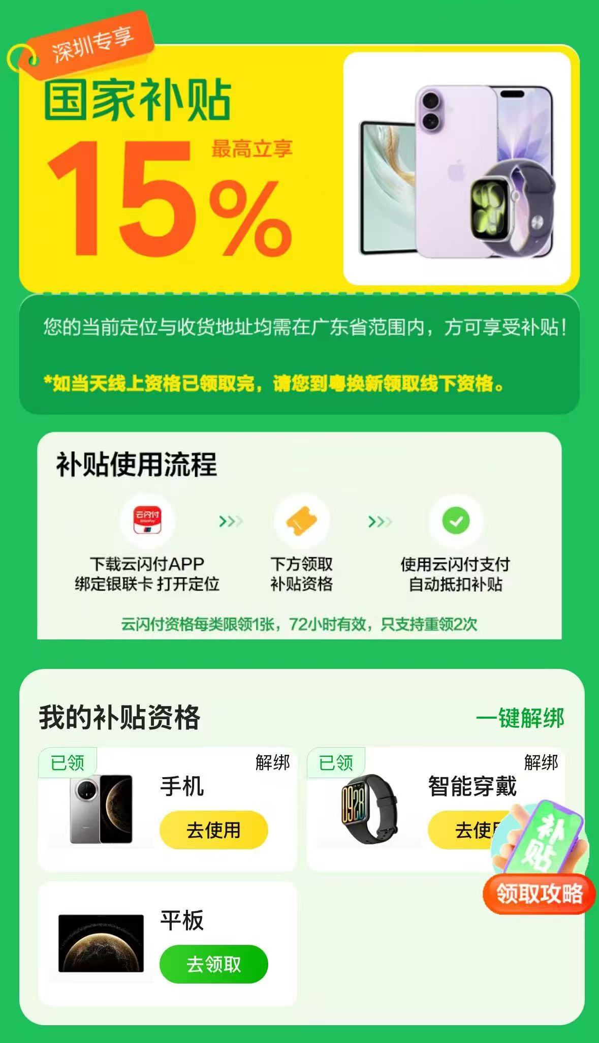 2026年,新一轮国补落地后,迅速点燃深圳消费市场热潮。今日起,市民用国补购物可获“30分钟手机平板到手”的更便捷、实惠体验。记者了解到,购物平台美团闪购联合华为、苹果、小米等品牌门店上线深圳国补。深圳市民在美团App搜索“国家补贴”即可进入相关页面,按规则领用15%的国补优惠,从附近品牌门店选购手机、平板和智能穿戴设备。记者实测发现,以一台原价5999元的256G iPhone 17手机为例,领用国补和平台补贴后,市民可省500元,最快半小时即可收到新机。