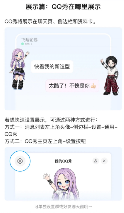 QQ秀最直观的变化,在于对社交身份标识——“头像”的突破。过去数十年,社交平台的头像始终局限于圆形或方形的静态框架中。QQ秀首次打破了这一常规,将用户的社交头像从一张静态图片升级为一个动态的形象。用户还可以给形象设置基础动作,如“搬砖”“摇花手”“捧腹大笑”等,则头像会变成做相应动作的动态的小人。这种“破框感”和“活人感”让线上交流变得前所未有的生动,用户可以在资料卡、个人主页、聊天场景里看见一个活灵活现的QQ秀小人。