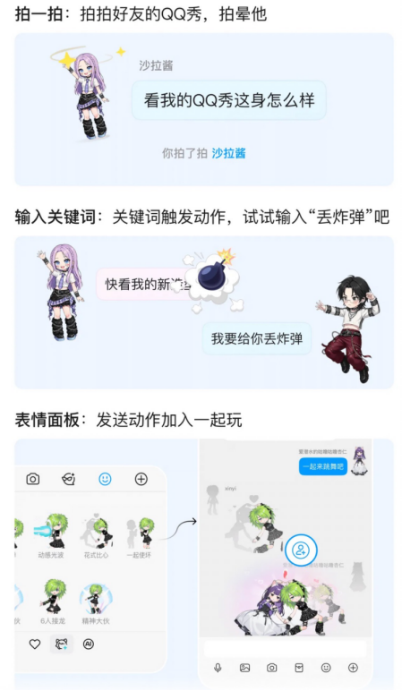 此外,在社交互动层面,QQ秀带来了更生动、更有参与感的玩法体验。过去,用户在聊天里拍一拍好友的头像,只能看到好友设置的趣味文案。现在,QQ秀小人代替头像进入了聊天场景里,拍一拍即可实现小人头晕目眩或原地起跳的效果,这种“破框而出”的生动反馈,让每一次轻互动都更鲜活;输入“哈哈哈”、“爱心”等特定关键词还会触发隐藏彩蛋,小人会根据关键词做出对应动作。