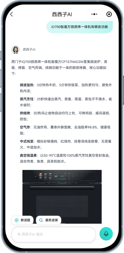 基于对中国消费者使用习惯与服务需求的长期洞察,西门子家电正式推出品牌首个AI智能体——“西西子”。对于消费者而言,西西子是一位7x24小时在线的全能管家,为消费者生命周期全链路提供从售前到售后的高质量体验。这不仅是前沿AI能力在家电领域的落地实践,更是西门子家电在智能服务体系上的一次系统性升级:让专业知识变得可对话、让复杂问题得到即时理解,也让“以用户为中心”的服务理念在数字时代拥有更清晰的实现路径。