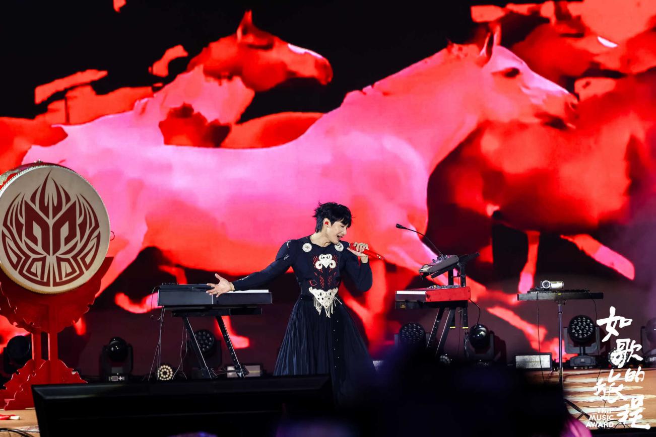 彝族歌手吉克隽逸以高亢辽阔、极具辨识度的民族唱腔登场,一曲《彩色的黑》如大凉山燃烧的火把,炽热而原始的力量穿透璀璨灯幕。阿吉太组合则带来了因短视频翻唱而广为人知的《阿衣莫》,马头琴的悠扬与呼麦的苍茫交织,成为民族流行融合的生动注脚。彝族说唱歌手Moseee莫色坚持用纯粹的彝语说唱,歌词中饱含对民族记忆与乡土深情的眷恋,质朴真挚,直击人心。音乐人CORSAK胡梦周身着彝族传统服饰,手持鼓槌,将激昂的电子节拍与传统的鼓点韵律创造性结合,让古老民族的脉搏在现代音浪中强劲跳动,实现了电子音乐与非遗灯会场景的惊艳碰撞。邓寓君(等什么君)以清冽嗓音,将数首国风经典细细铺展,勾勒出一幅江湖写意的水墨长卷;Winky诗身着一席精致国风妆造,浅吟低唱间,婉转戏腔与现场氛围曼妙相融,仿若千载古韵穿过时光的帘幕,在国风舞台翩然苏醒;以冬则身披一袭烟粉汉服,空灵声线如轻羽拂过星河,在万千烟火的交错中悠然流淌,仿佛将盛唐的璀璨天河引入灯海夜空,古典意境与现代视听在此刻浑然一体。