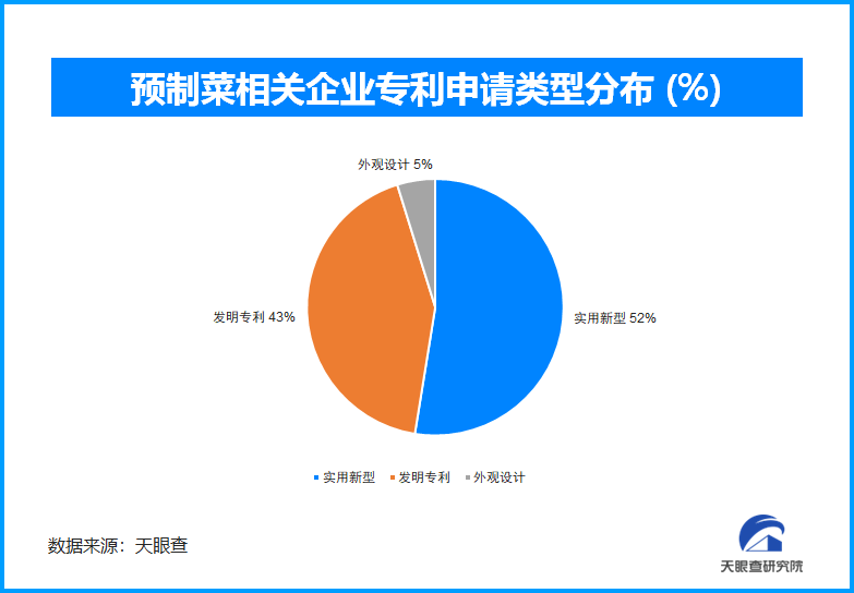 天眼查专业版数据显示,在预制菜方面的相关专利申请共1650件,其中,实用新型专利和发明专利占比最高,分别占比52%和43%。快速、便捷是预制菜最大的特点,而为了维持这一特点,发明专利多围绕计量、解冻、加热、营养检测等多方位,充分证明了该领域的“技术”基因。