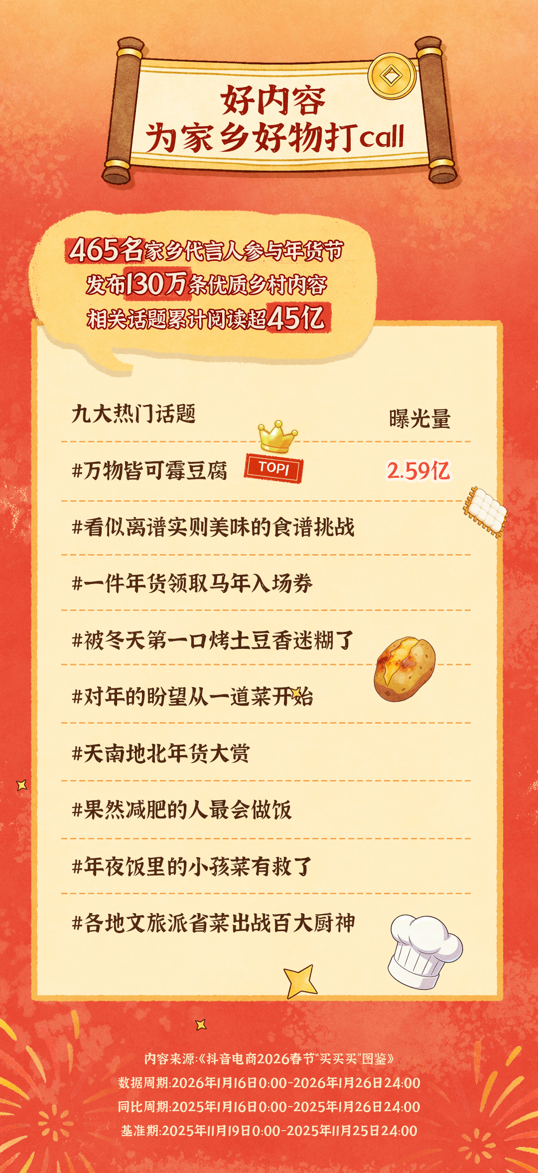 此外,图文、短视频和直播间的好内容进一步激活好生意,直播电商已成为连接产地优品与新春餐桌的纽带,让年夜饭更鲜、更暖、更有新意,助推“年味经济”焕发新活力。