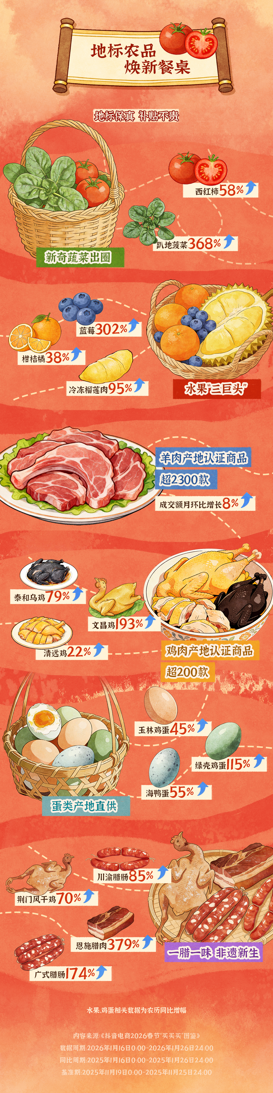 肉类与蛋类产品则凸显“产地直供”优势。图鉴显示,年货节期间,抖音电商平台共上线获得产地认证的羊肉商品超2300款,销售额月环比增长8%。鸡肉品类中,“风味差异化”需求增长明显,文昌鸡、泰和乌鸡等地方特色品种增速显著。蛋类产品中,绿壳鸡蛋、海鸭蛋和玉林鸡蛋等特色蛋品受青睐,成交额同比增长115%、55%和45%。