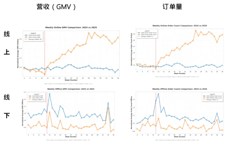 (图)样本商户2024年和2025年在线上/线下平均营收及订单量对比