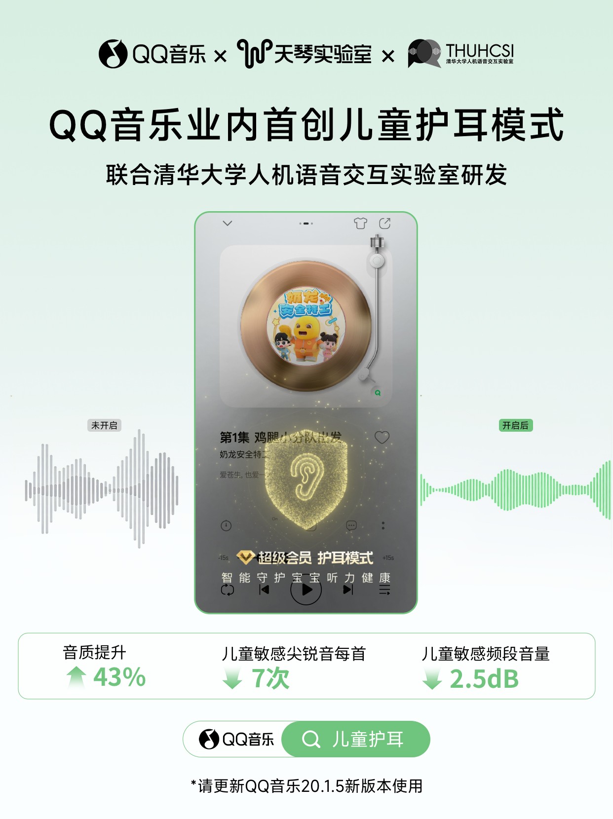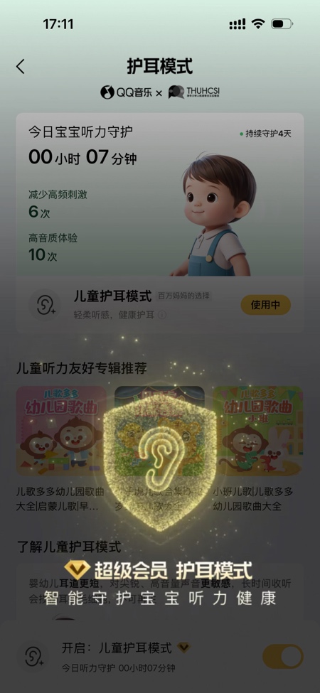 为保护儿童的听力,腾讯音乐天琴实验室联合清华大学人机语音交互实验室推出“儿童护耳模式”,在QQ音乐上线。QQ音乐在保持音乐和有声内容完整性性前提下,减轻在易受损频段的听力负担,减少突兀高音与爆鸣带来的脉冲损伤,同时以臻品母带级无损音质还原被压缩抹去的高频细节与低频厚度。在该模式下,音质平均提升43%,儿童敏感尖锐音每首平均降低7次,儿童敏感频段音量平均降低2.5dB。