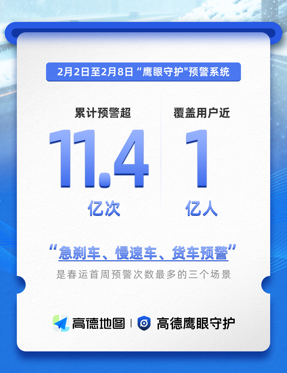 数据显示,“鹰眼守护”在春运首周累计播发安全预警超11.4亿次,覆盖全国近1亿出行用户;春运首个高峰日(2月8日),“鹰眼守护”全天播发预警超2.2亿次;其中,急刹车、慢速车、货车预警成为首周预警次数最多的三大场景。